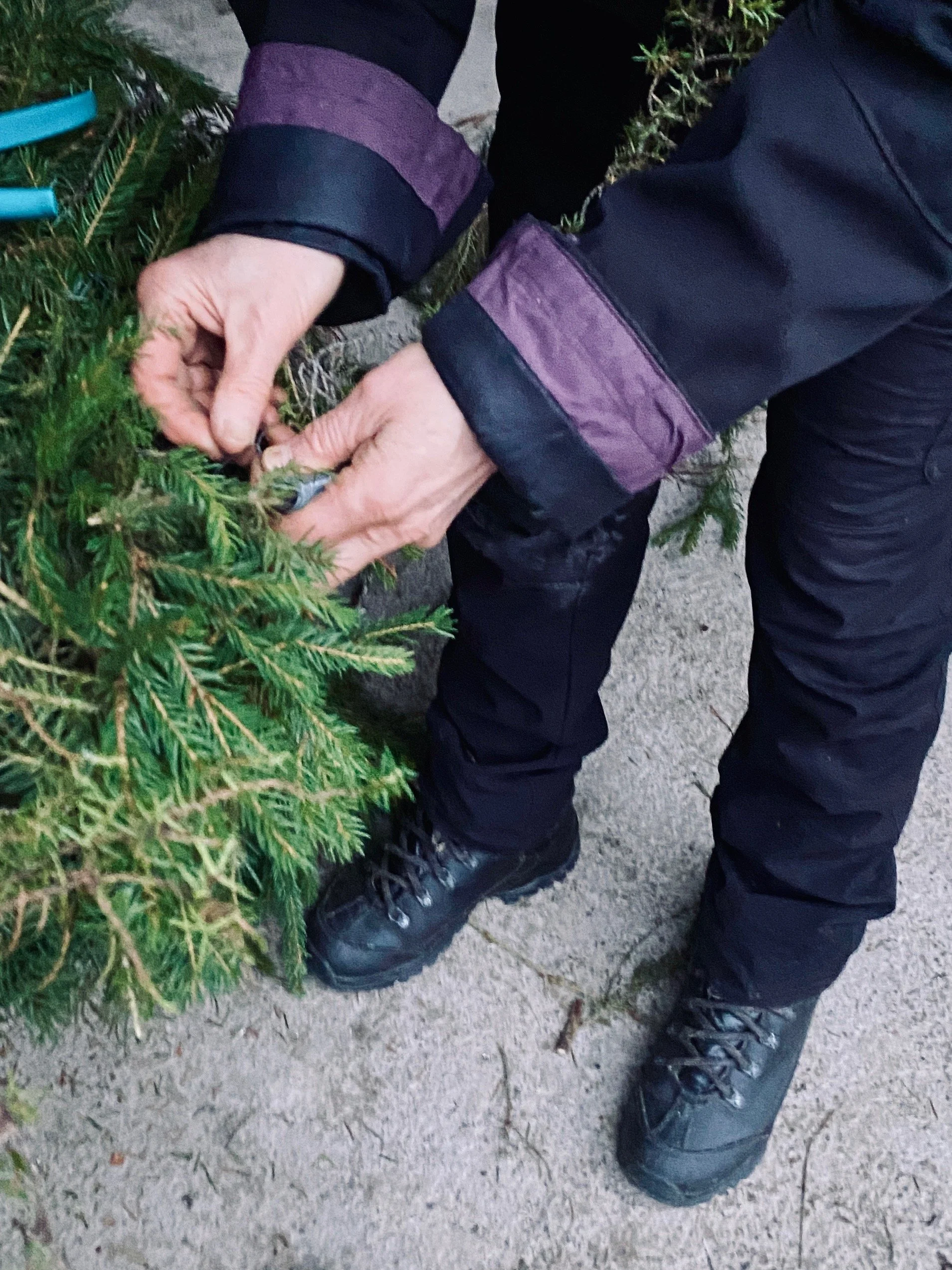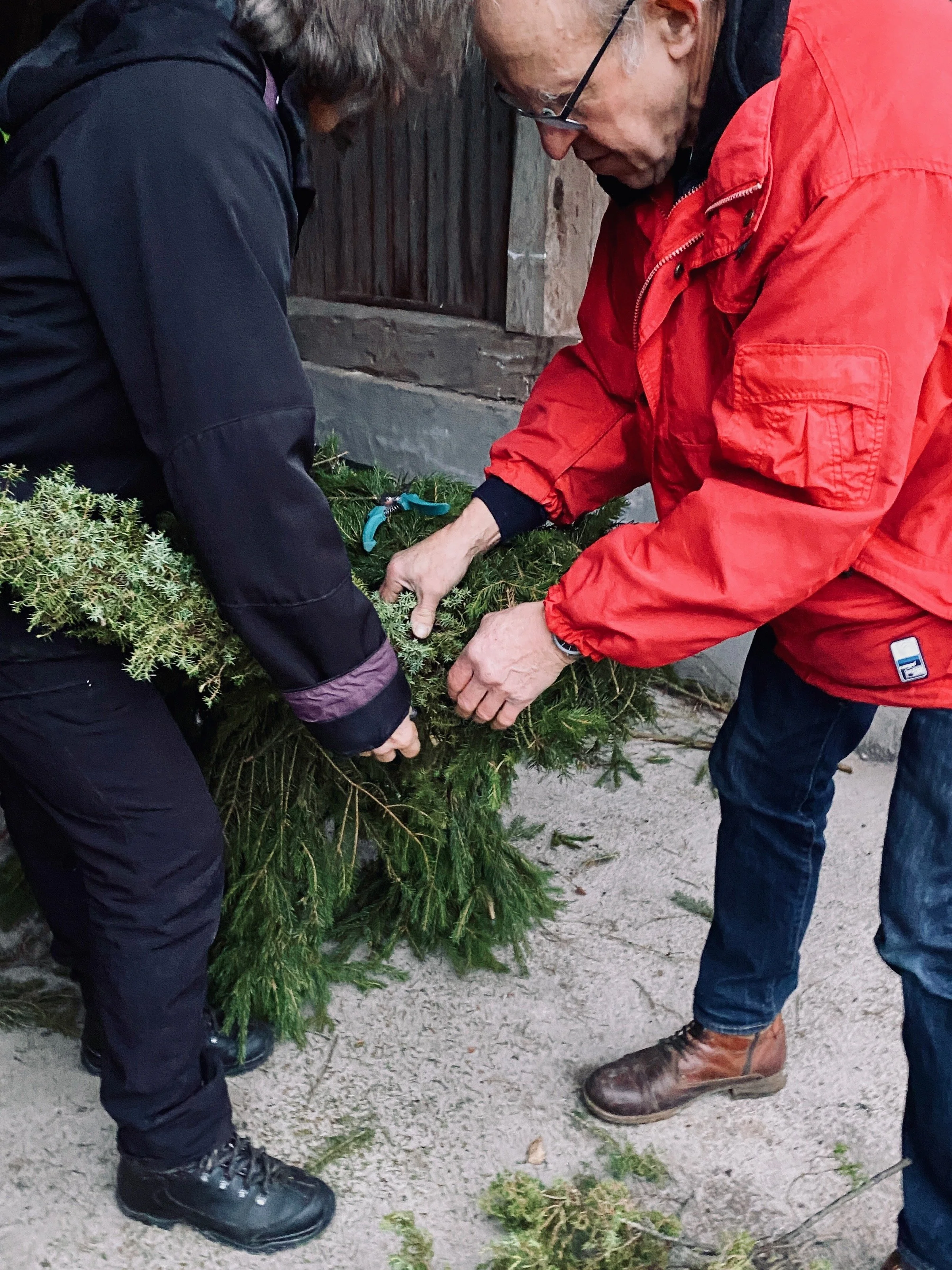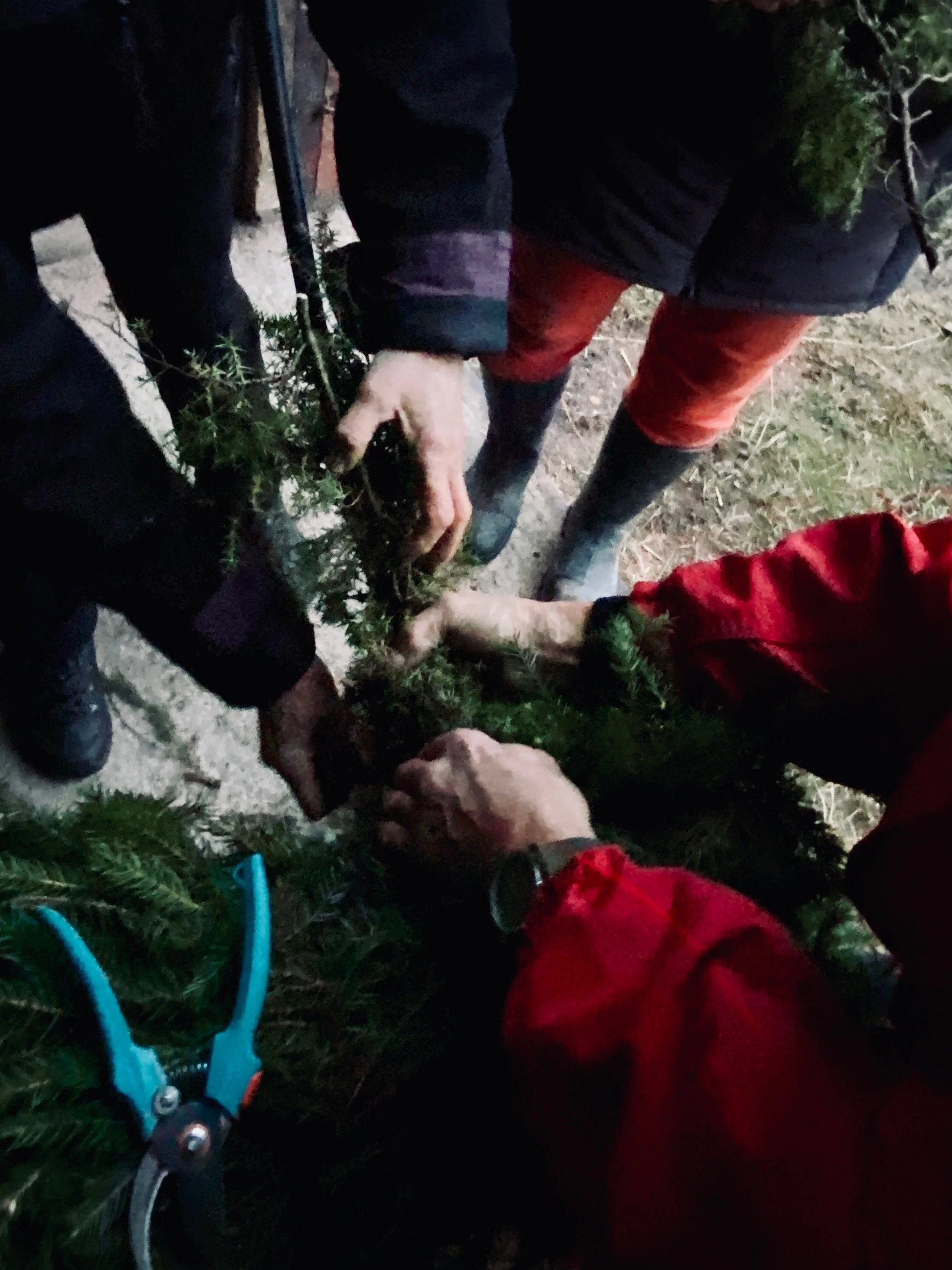 Rhiannon och Thomas hade förberett väl med grangrenar, tråd och verktyg. Även kons ben var färdiga!