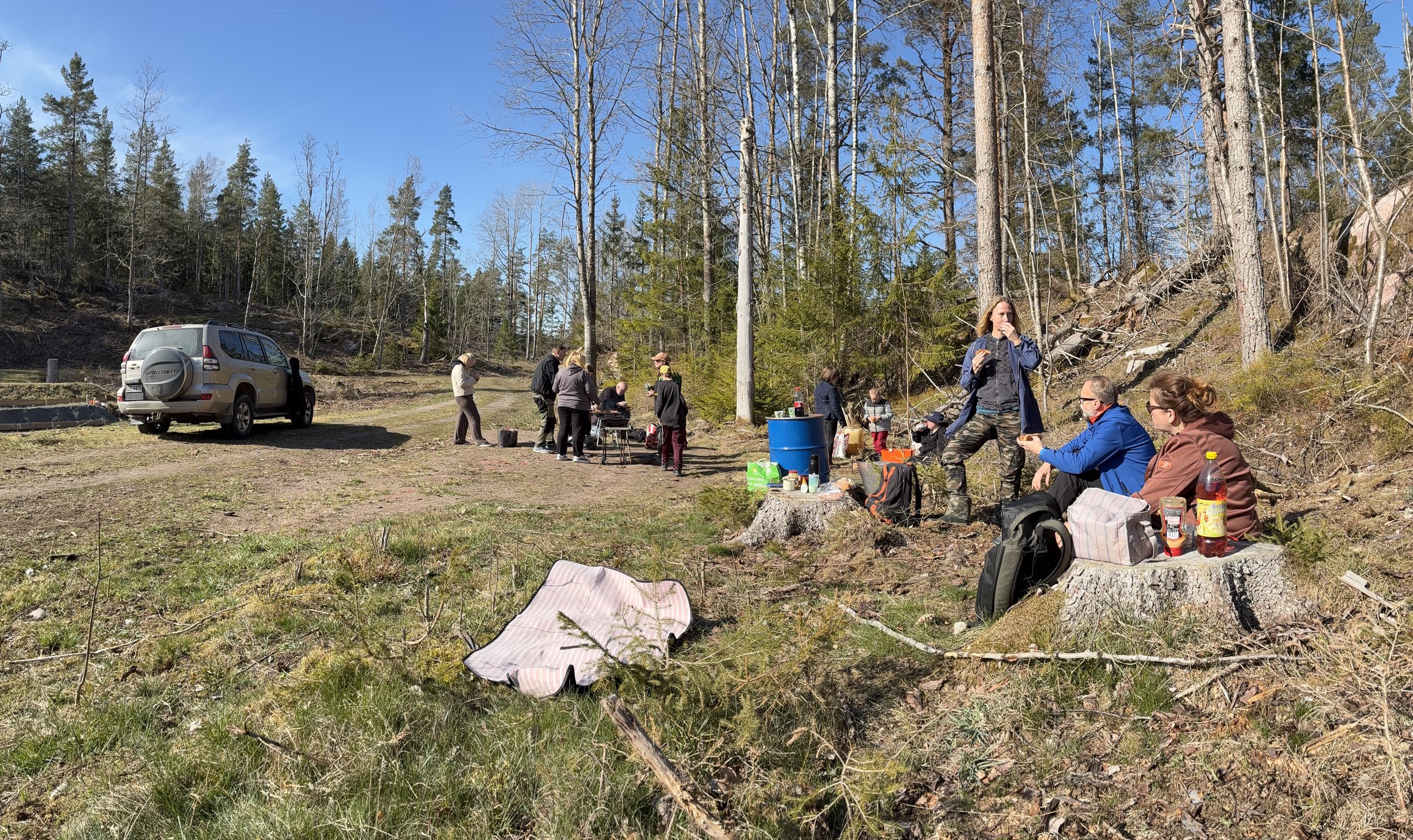 Efter att vi gick lite fel hittade vi till Överums pistolskyttebana. Maja förberedde redan grillen, vi gick upp till berget och där var det en fin utsikt över sjön Ryven. Johnny berättade lite om historien av platsen vilket fick igång gruppen och vi diskuterar om hur det var i förtiden. Barnen lekte med hunden Sissi och klättrade på varenda stor sten. Efter vandringen var det bra med lite korv och gott att dricka. Solen var med oss och då var det bara att njuta av den härliga stunden.